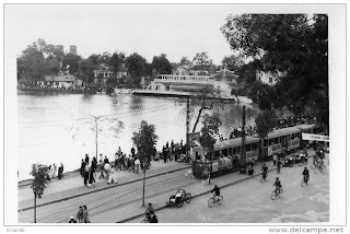 Tàu điện trên bến Bờ Hồ, phía trước là nhà Thủy Tạ – Anh Vophi