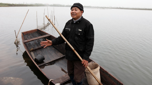 Không dám đầu tư nữa, chiều chiều ông Lương Văn Trong (phó chủ tịch liên chi hội nuôi trồng thủy sản huyện Tiên Lãng) đẩy thuyền đặt đó để đánh bắt vài con tôm cá cho đỡ nhớ đầm – Ảnh: Việt Dũng (TTO) [Ngày 16/1/2012]