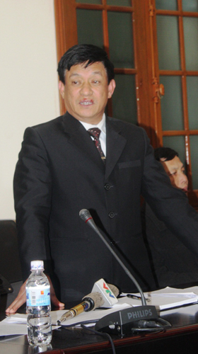 Ông Đỗ Trung Thoại – Phó chủ tịch UBND tỉnh Hải Phòng  trình bày tại cuộc giao ban báo chí. Ông cho rằng dân phá nhà ông Vươn- Ảnh: N.H.K. (TTO)