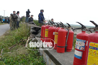 Hàng chục bình chữa cháy được tập kết trên đê – Ảnh: Hải Phong (TTO)